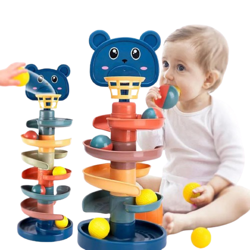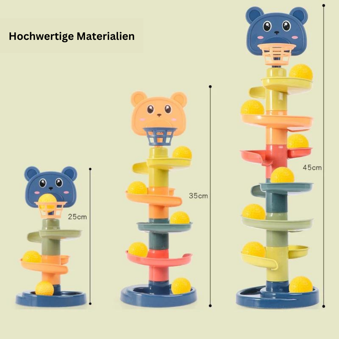 Die zusätzlichen 5 oder 7 Kugeln, die die Strecke hinunterrollen, sorgen nicht nur für visuelle Freude, sondern bieten auch Ihrem Kleinkind die Möglichkeit, spielerisch den Korb zu treffen – eine unterhaltsame Herausforderung für die Koordination und Zielgenauigkeit.